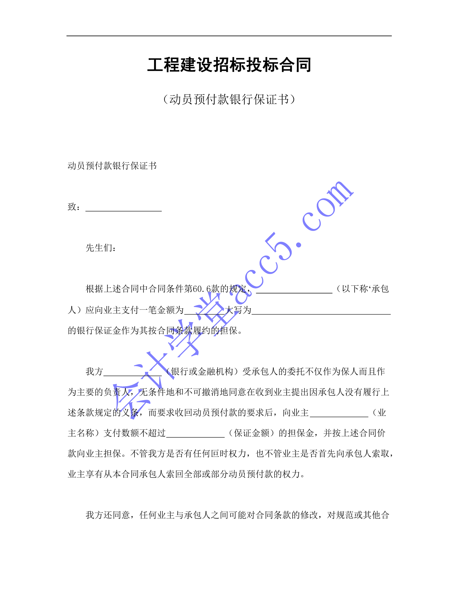 工程建設招標投標合同(動員預付款銀行保證書)介紹: